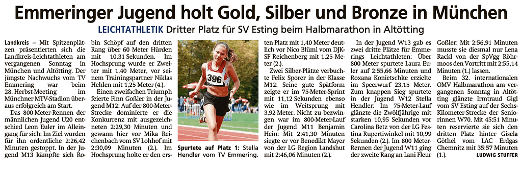 In der Jugend W13 gab es zwei dritte Plätze für Emmerings Leichtathleten: Über 800 Meter spurtete Laura Euler auf 2:55,66 Minuten und Roxana Konietschke erzielte im Speerwurf 23,15 Meter. Zum knappen Sieg spurtete in der Jugend W12 Stella Hendler: Im 75-Meter-Lauf glänzte die Zwölfjährige mit starken 10,95 Sekunden vor Carolina Betz von der LG Festina Rupertiwinkel mit 10,99 Sekunden (2.).