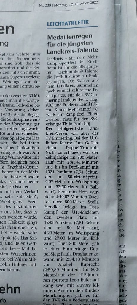 Medaillenregen für die jüngsten Landkreis-Talente 17. Oktober 2022 News & Presse, Presse 17.10.2022 / Münchner Merkur Schlagwörter: Medaillen, Sieger, Talente, TV Emmering