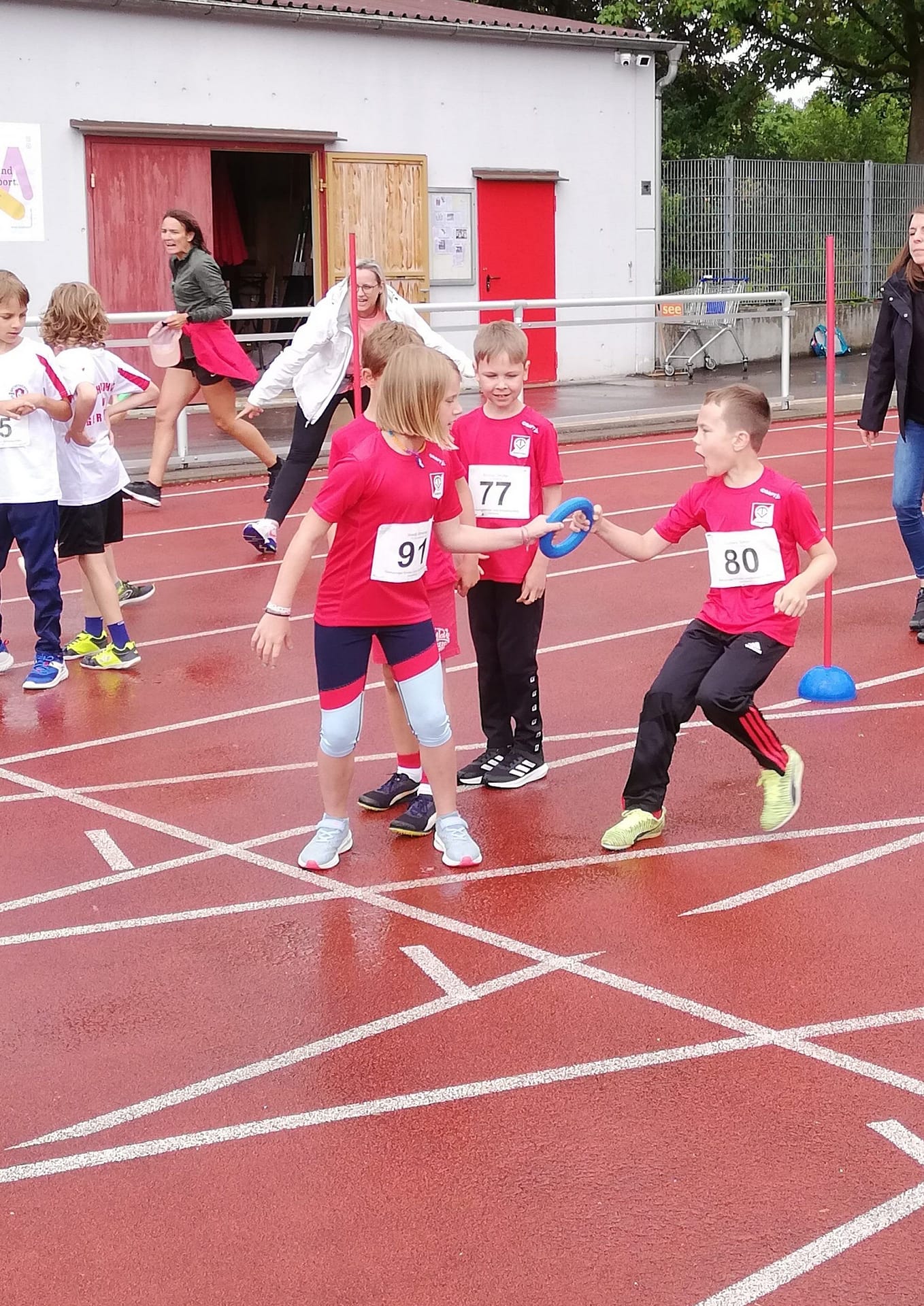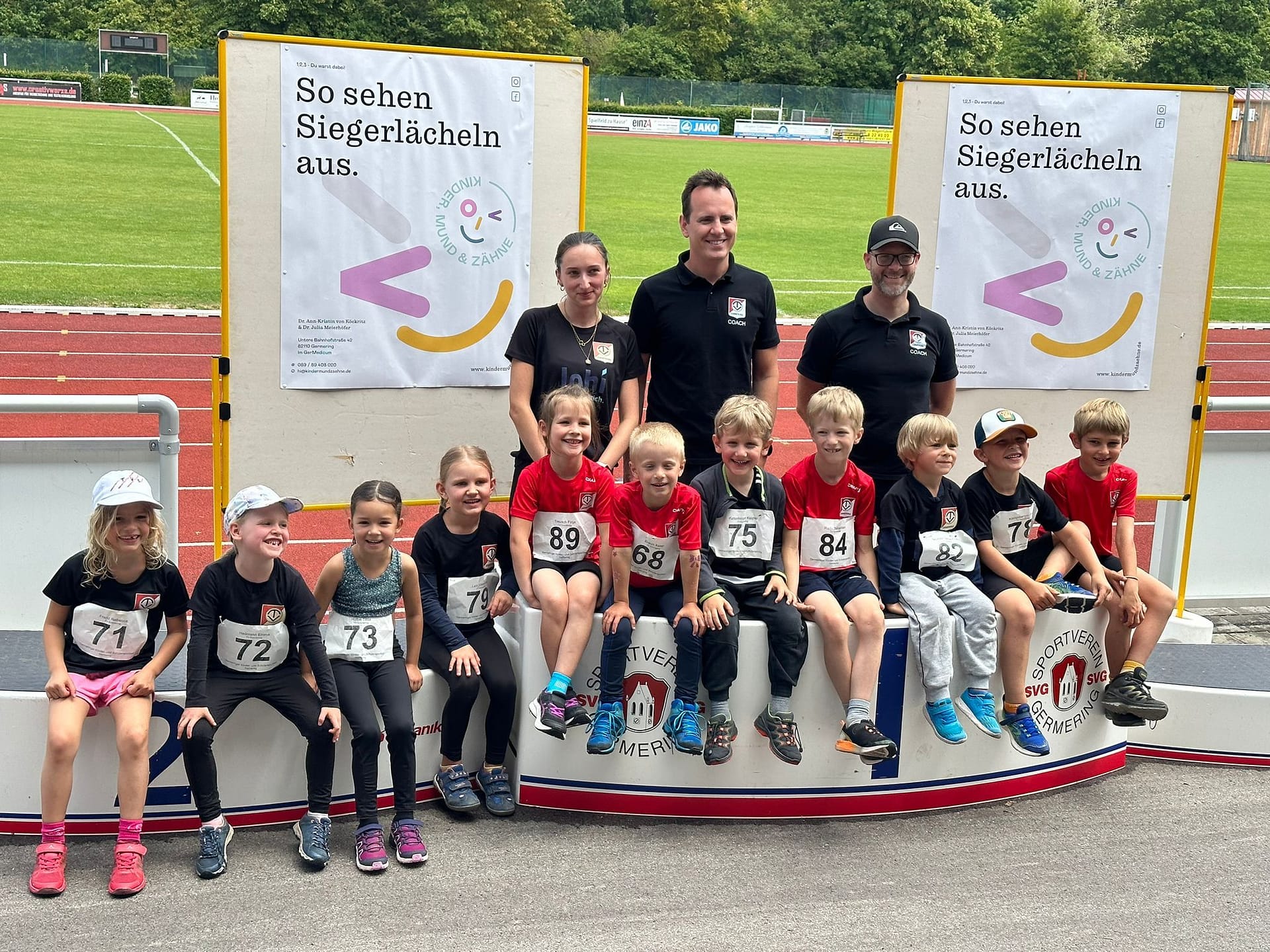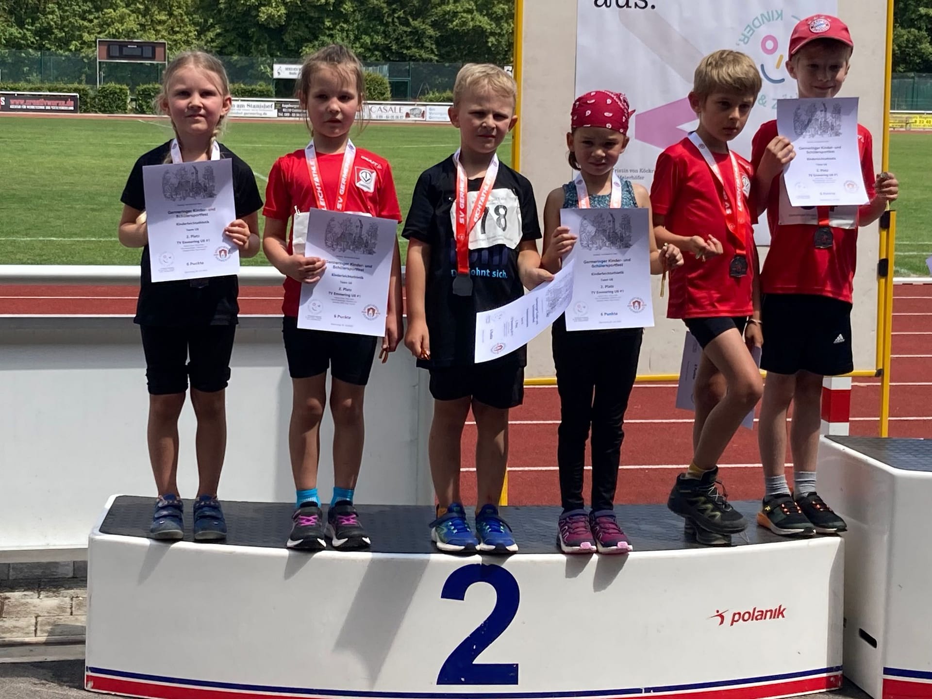 Emmerings Leichtathletik-Nachwuchs begab sich am 02.07.23 ins benachbarte Germering, um den nächsten Teamwettkampf zu absolvieren. Bei Nieselregen und kühlen, fast schon herbstlichen Temperaturen, trafen die kleinen Athletinnen und Athleten der U8 und U10 im Stadion am örtlichen Hallenbad ein. „Die (Lauf)Bahn und der Weitsprungsand sind ganz schön glatt und glitschig“, stellten sie beim Aufwärmen fest.